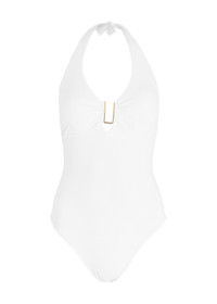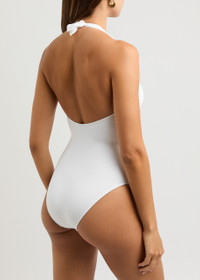 Info & Care Melissa Odabash stretch-polyamide swimsuit; Halterneck, structured U metal embellishment at bust, removable padding at cups, open back; Ties at neck; 86% polyamide, 14% elastane; Hand wash; Size & Fit Model is 5'10"/ 178cm and wears a size IT40;