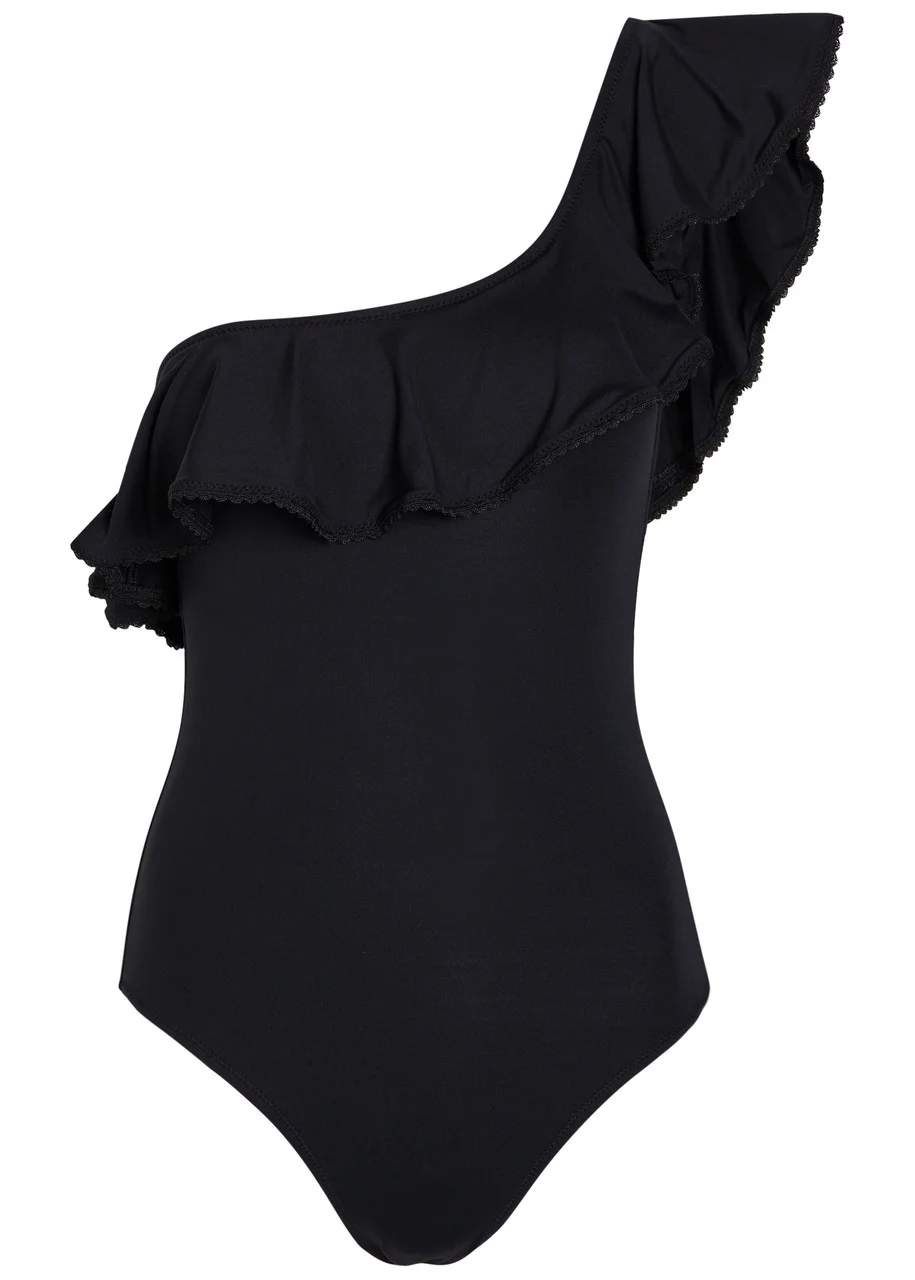 Info & Care Melissa Odabash stretch-polyamide swimsuit; Asymmetric off-the-shoulder neckline, frill trim with scalloped lace detail,; removable; padded; cups, ;elasticated trims,;fully lined; 86% polyamide, 14% elastane; Hand wash; Size & Fit Model is 5'10"/ 178cm and wears a size IT40