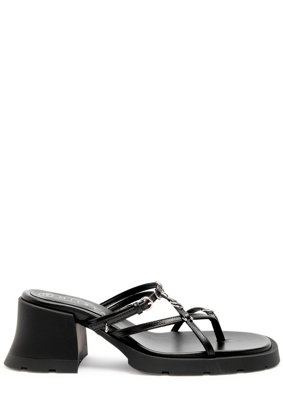 Info & Care Miista leather mules Heel measures approximately 2.5 inches/ 65mm Cross-over straps, thong toe post, metal ring embellishments,;gripped rubber sole, open square toe Adjustable buckle-fastening strap Size & Fit Only available in full sizes, go up to the nearest whole size if you take a half size