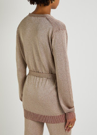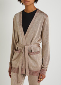 Info & Care Missoni fine-knit;cardigan Lame weave, V-neck, belt loops, detachable waist tie, front patch pockets, ribbed trims Slips on 87% viscose, 13%;metallic fibres Dry clean Coordinating items available Size & Fit Length shoulder to hem: 30 inches/ 76.5cm Midweight Loose fit, use tie to cinch waist Model is 5'9"/ 175cm and wears a size;IT40