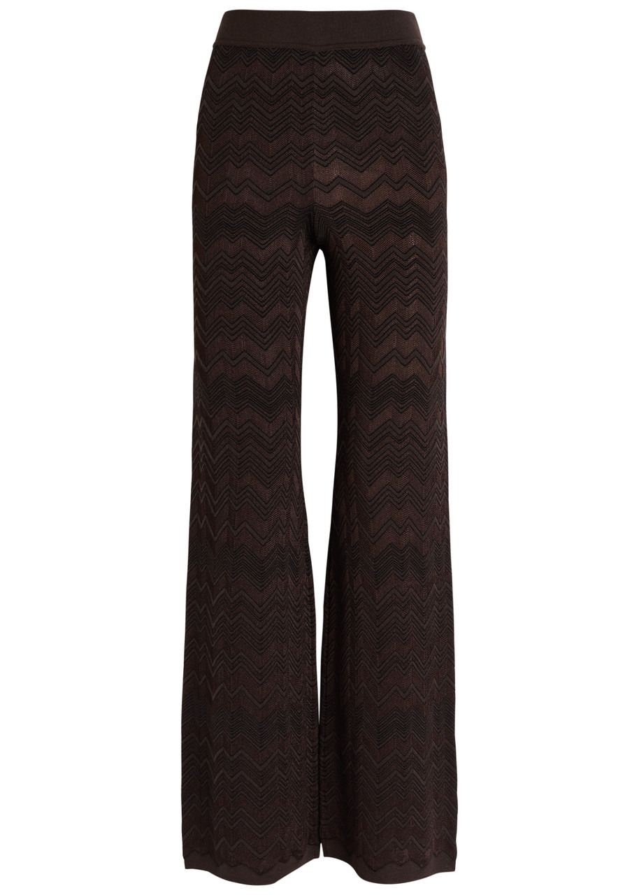 Info & Care Missoni fine-knit;trousers Chevron,;ribbed elasticated waistband Pull on 57% viscose,;31% wool, 9% polyester, 2% polyamide, 1% elastane Dry clean Size & Fit Inside leg length: 32 inches/ 81.5cm Midweight Slim fit, flared-leg cut Model is 5'9"/ 175cm and wears a size;IT40