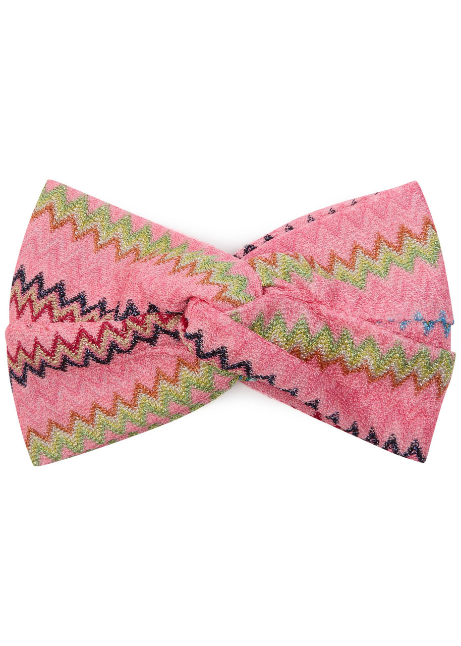 Info & Care Missoni knitted headband Zigzag intarsia, metallic weave, knotted design 90% viscose, 10% polyester Dry clean Size & Fit Width: 6.5 inches/ 16.5cm