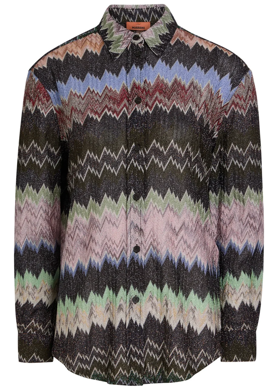 Info & Care Missoni fine-knit;shirt Metallic weave, raschel knit with snake pattern,;button-fastening cuffs, curved hem, longer back hem Button fastenings through front; 83% viscose, 17% metallic fibres Dry clean Size & Fit Length shoulder to hem: 26 inches/ 66cm; back: 30 inches/ 76cm Midweight Regular fit Model is 5'10"/ 178cm and wears a size;IT40