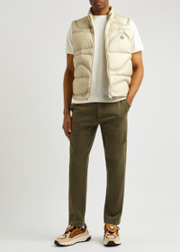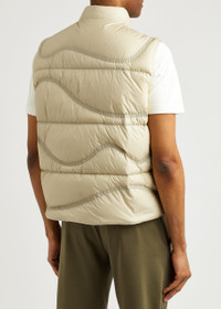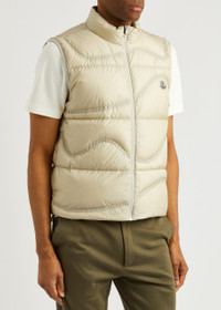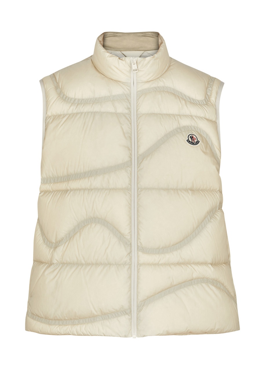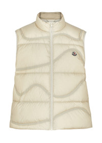 STYLE NOTES This season, Moncler takes inspiration from the nautical world and the Beidaihe gilet is quilted with a wavy pattern that resembles the movement of the water. Easy to layer, this sleeveless shell style is padded with warming down and cut to a slim fit with a protective high collar. INFO & CARE - Moncler shell gilet - Quilted, high-neck, designer plaque, side slip pockets, concealed toggle-fastening hem, internal zip-fastening pocket, fully lined - Zip fastening through front - 100% polyamide; lining: 100% polyamide; fill: 90% down, 10% feather - Machine wash SIZE & FIT - Length shoulder to hem: 25 inches/ 63.5cm - Midweight - Slim fit - Model is 6'2"/ 188cm, chest size 38 inches and wears a size 3