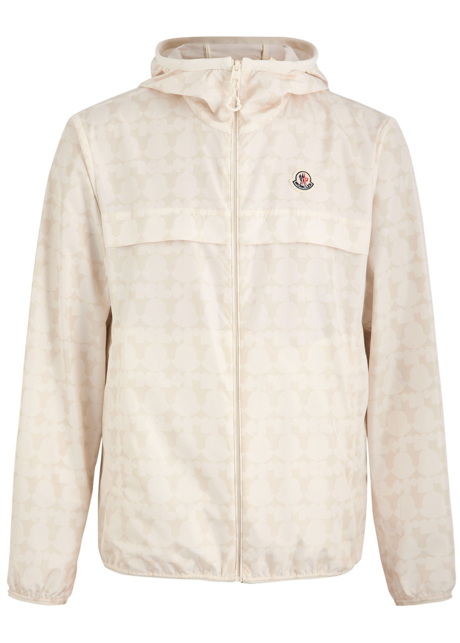 INFO & CARE - Moncler shell jacket - Water repellent, logo monogram print, drawstring hood, elasticated cuffs, logo plaque at chest, zip-fastening front pockets, elasticated knitted trims - Zip fastening through front - 100% polyester - Hand wash SIZE & FIT - Length shoulder to hem: 28 inches/ 71cm - Lightweight - Relaxed fit - Model is 6'1"/ 185cm, chest size 38 inches and wears a size 2