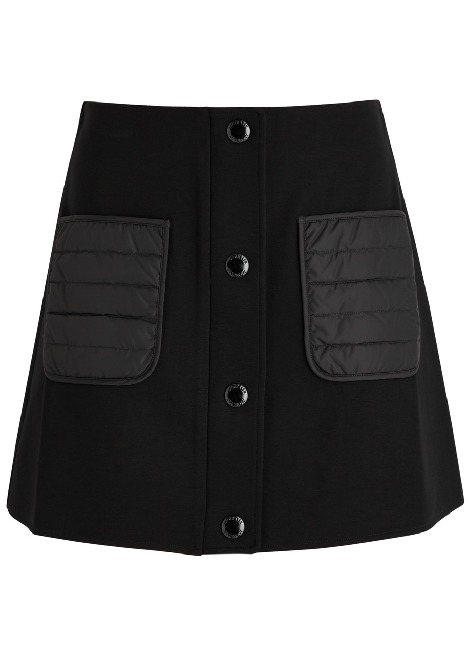INFO & CARE - Moncler jersey skirt - Two quilted shell patch pockets, designer plaque at back - Concealed press-stud and zip fastenings at front - Fabric1: 71% viscose, 24% polyamide, 5% elastane; fabric 2: 100% polyamide; fill: 90% down, 10% feathers - Machine wash SIZE & FIT - Length waist to hem: 16 inches/ 41cm - Midweight - Slim, A-line fit - Model is 5'7"/ 170cm and wears a size small