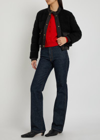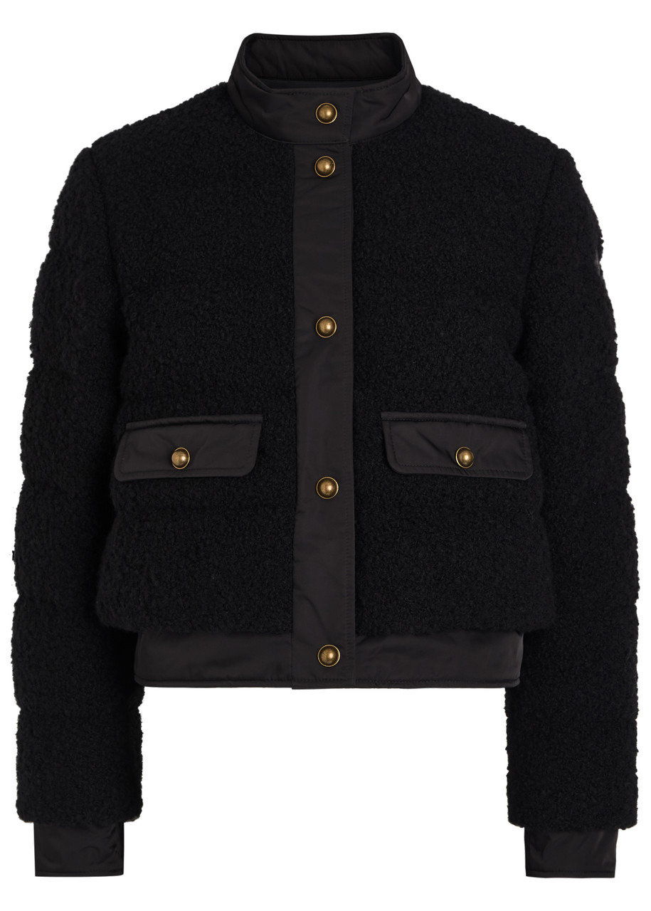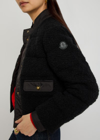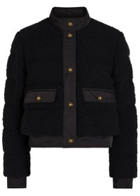 Info & Care Moncler boucle jacket Padded, stand collar, designer applique at sleeve, press-stud fastening front flap pockets, shell trims, fully lined Press-stud fastenings through front Fabric 1: 41% acrylic, 35% wool, 24% polyester; trims: 100% polyester; lining: 100% polyamide; filling: 90% pure goose down, 10% feathers Dry clean Size & Fit Length shoulder to hem: 20 inches/ 51cm Midweight Slim fit, boxy style Model is 5'10"/ 178cm and wears a size;0