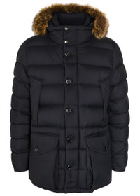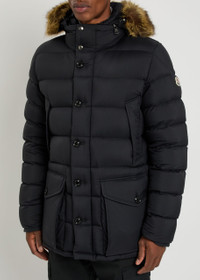 Info & Care Moncler nylon jacket Padded, detachable hood with detachable faux fur trim, high neck, designer crest applique at sleeve, chest slip pockets, button-fastening front flap pockets, fully lined Partially concealed two-way zip and button fastenings through front 100% polyamide; lining: 100% polyester; filling: 90% pure goose down, 10% goose feather Hand wash Size & Fit Length shoulder to hem: 29 inches/ 73.5cm Midweight Regular fit Model is 6'1"/ 185cm, chest size 38.5 inches and wears a size;2
