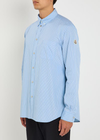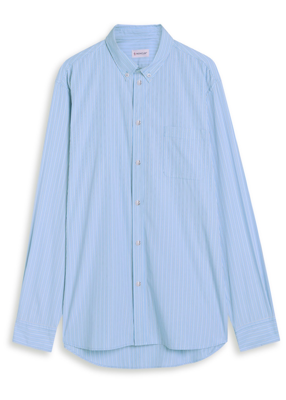 Info & Care Moncler cotton shirt Striped, button-down collar, designer applique at sleeve, button and press-stud fastening cuffs, chest patch pocket, box pleat at back, curved hem, longer back hem Press-stud fastenings through front 100% cotton Machine wash Size & Fit Length shoulder to hem: 30 inches/ 76cm; back: 32 inches/ 81cm Midweight Relaxed fit Model is 6'1"/ 186cm, chest size 38 inches and wears a size medium