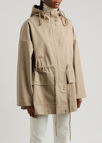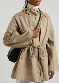 Info & Care Moncler cotton-blend poplin parka; Drawstring hood at high neck, dropped shoulders, designer plaque, two flap front patch pockets, drawstring waist; Concealed press-stud and zip fastenings through front; 87% cotton, 13% polyester Dry clean; Size & Fit Length shoulder to hem: 31.5 inches/ 80cm Midweight; Loose fit, use drawstring to cinch the waist;