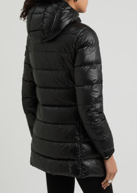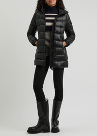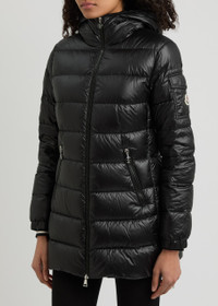 Info & Care Moncler shell jacket; Quilted, hood at high-neck, designer;applique at press-stud fastening sleeve pocket, elasticated cuffs, zip-fastening front pockets, fully lined Two-way zip-fastening through front; 100% polyamide; fill: 90% down, 10% feathers Hand wash Size & Fit Length shoulder to hem: 30 inches/ 76cm Midweight Regular fit Model is 5'9"/ 175cm and wears a size 0