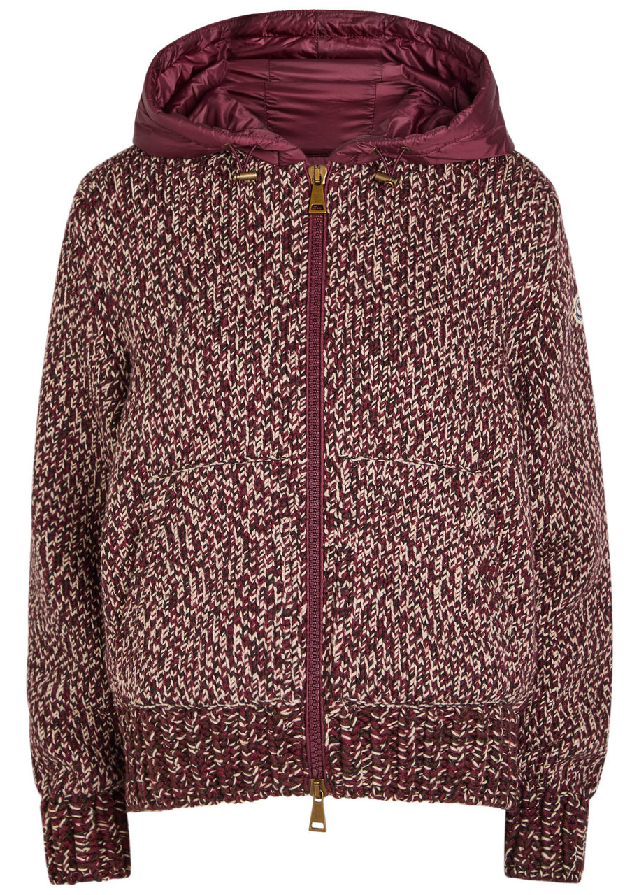 Info & Care Moncler wool cardigan Toggle-fastening shell hood, designer applique at sleeve, front slip pockets, ribbed trims, fully lined Two-way zip-fasteing through front Fabric 1: 100% virgin wool; fabric 2: 100% polyamide; lining: 100% polyamide Dry clean Size & Fit Length shoulder to hem: 23 inches/ 58.5cm Midweight Relaxed fit Model is 5'9"/ 175cm and wears a size small