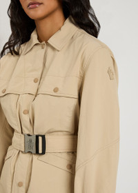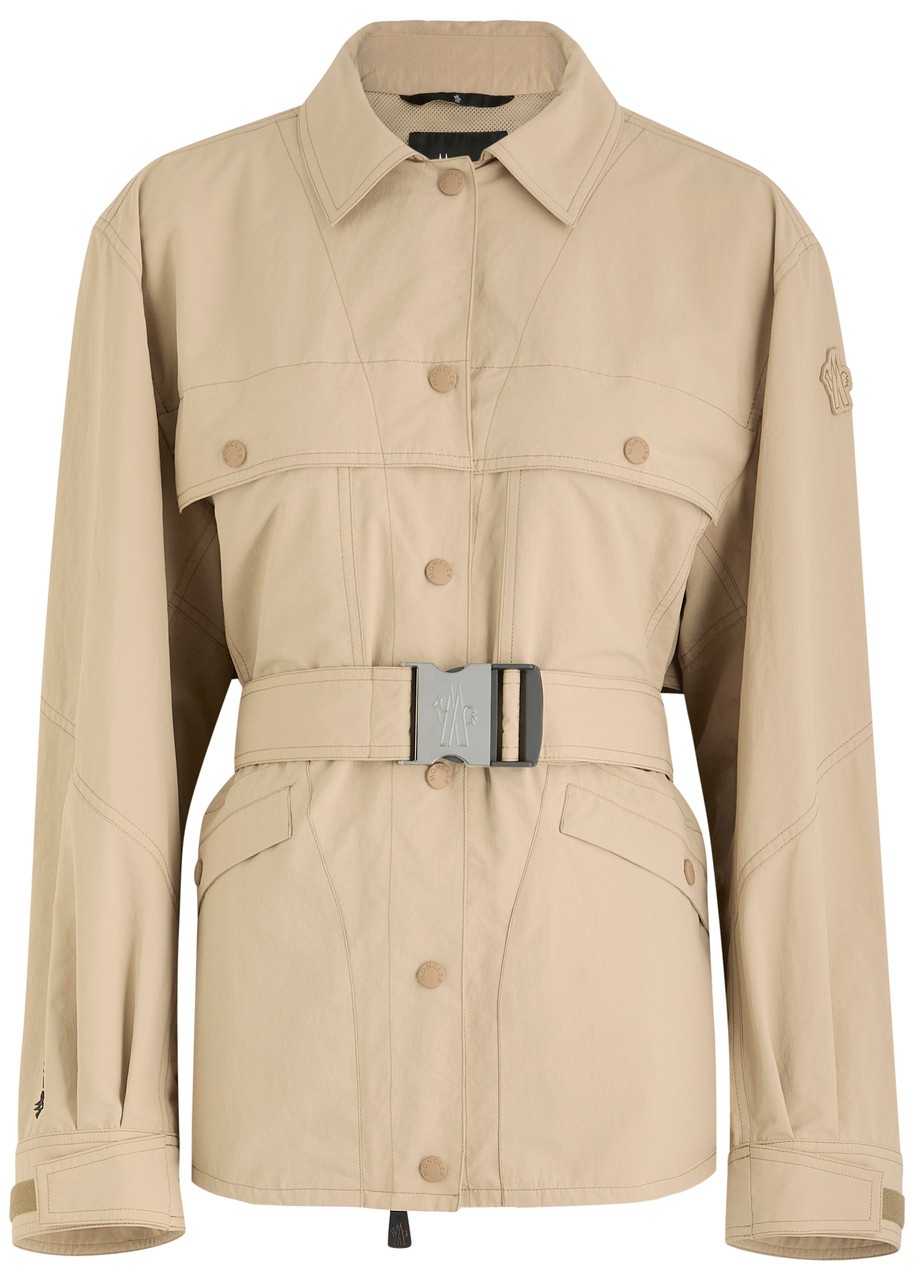Info & Care Moncler Grenoble shell shirt jacket Suede designer applique at sleeve, rubberised debossed logo at velcro-fastening cuff, four front press-stud fastening pockets, belt loops, detachable buckle-fastening belt, reflective logo at storm flap, side splits at curved hem, rubber logo engraved eyelets, fully lined Partially concealed press-stud and two-way zip fastening at front; 100% polyester; lining: 100% polyamide Machine wash Size & Fit Length shoulder to hem: 25.5 inches/ 64.5cm Midweight Regular fit, use belt to cinch the waist Model is 5'10"/ 178cm and wears a size;1