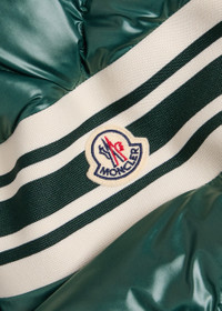 Info & Care Moncler shell jacket Padded, detachable press-stud fastening hood at high-neck, striped intarsia with designer applique at sleeve, adjustable press-stud fastening cuffs, zip-fastening side pockets, toggle-fastening at hood and hem Two-way zip fastening at front 100% polyester; filling: 90% pure goose down, 10% feather Hand wash Size & Fit Length shoulder to hem: 26 inches/ 66cm Midweight Regular fit Model is 6'1"/ 186cm, chest size 38.5 inches and wears a size;2