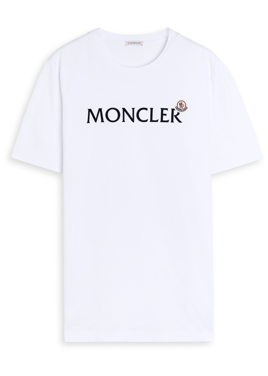 Info & Care Moncler cotton T-shirt Ribbed crew-neck, embroidered designer applique and felt logo across front Slips on 100% cotton Machine wash Size & Fit Length shoulder to hem: 28.5 inches/ 72.5cm Midweight Relaxed fit Model is 6'1"/ 186cm, chest size 38.5 inches and wears a size medium