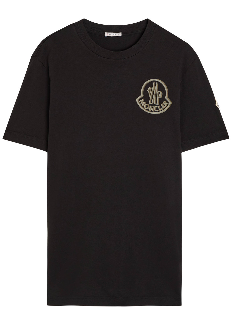 Info & Care Moncler cotton T-shirt Ribbed crew-neck, embroidered designer applique at sleeve, felt designer print at chest; Slips on 100% cotton Machine wash Size & Fit Length shoulder to hem: 28 inches/ 71cm Midweight Relaxed fit Model is 6'1"/ 185cm, chest size 38.5 inches and wears a size medium