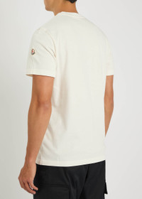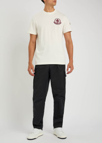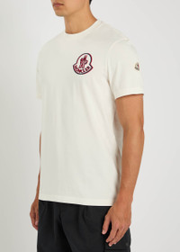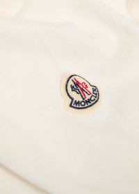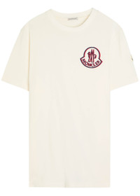 Info & Care Moncler cotton T-shirt Ribbed crew-neck, embroidered designer applique at sleeve, felt designer print at chest; Slips on 100% cotton Machine wash Size & Fit Length shoulder to hem: 28 inches/ 71cm Midweight Relaxed fit Model is 6'1"/ 185cm, chest size 38.5 inches and wears a size medium