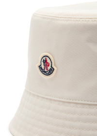Info & Care Moncler twill bucket hat; Designer plaque, concentric stitching at brim, fully lined 85% polyester, 15% cotton; lining: 100% cotton; Hand wash; Size & Fit Brim depth: 5cm