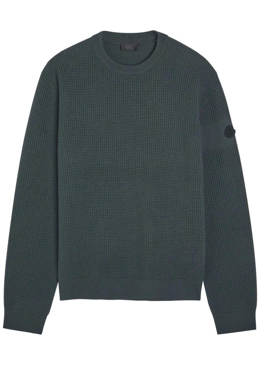 Info & Care Moncler wool jumper; Waffle knit, Round-neck, rubberised designer plaque at sleeve, ribbed trims Slips on 100% virgin wool; Dry clean; Size & Fit Length shoulder to hem: 27.5 inches/ 70.5cm Midweight Regular fit Model is 6'2"/ 188cm, chest size 38 inches and wears a size medium