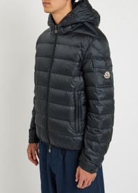Info & Care Moncler shell jacket; Padded, designer-embroidered hood, logo applique at sleeve, press-stud fastening patch pocket at sleeve, press-stud fastening tabs at adjustable elasticated cuffs, logo-enamelled zip-pulls, two front;zip-fastening pockets, designer-engraved hardware, elasticated trim at hem, internal zip-fastening pocket, fully lined Two-way zip fastening through front 100%;polyamide; filling: 90% down, 10% feather Hand wash Size & Fit Shoulder length to hem: 26 inches/ 66.5cm Midweight Regular fit Model is 6'1"/ 185cm, chest size 38 inches and wears a size 2