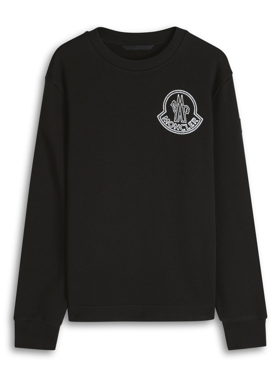 Info & Care Moncler cotton sweatshirt Crew-neck, designer applique at sleeve, designer print at chest, ribbed trims Slips on 100% cotton Machine wash Size & Fit Length shoulder to hem: 26 inches/ 66cm Midweight Slightly relaxed fit Model is 6'1"/ 185cm, chest size 38.5 inches and wears a size medium