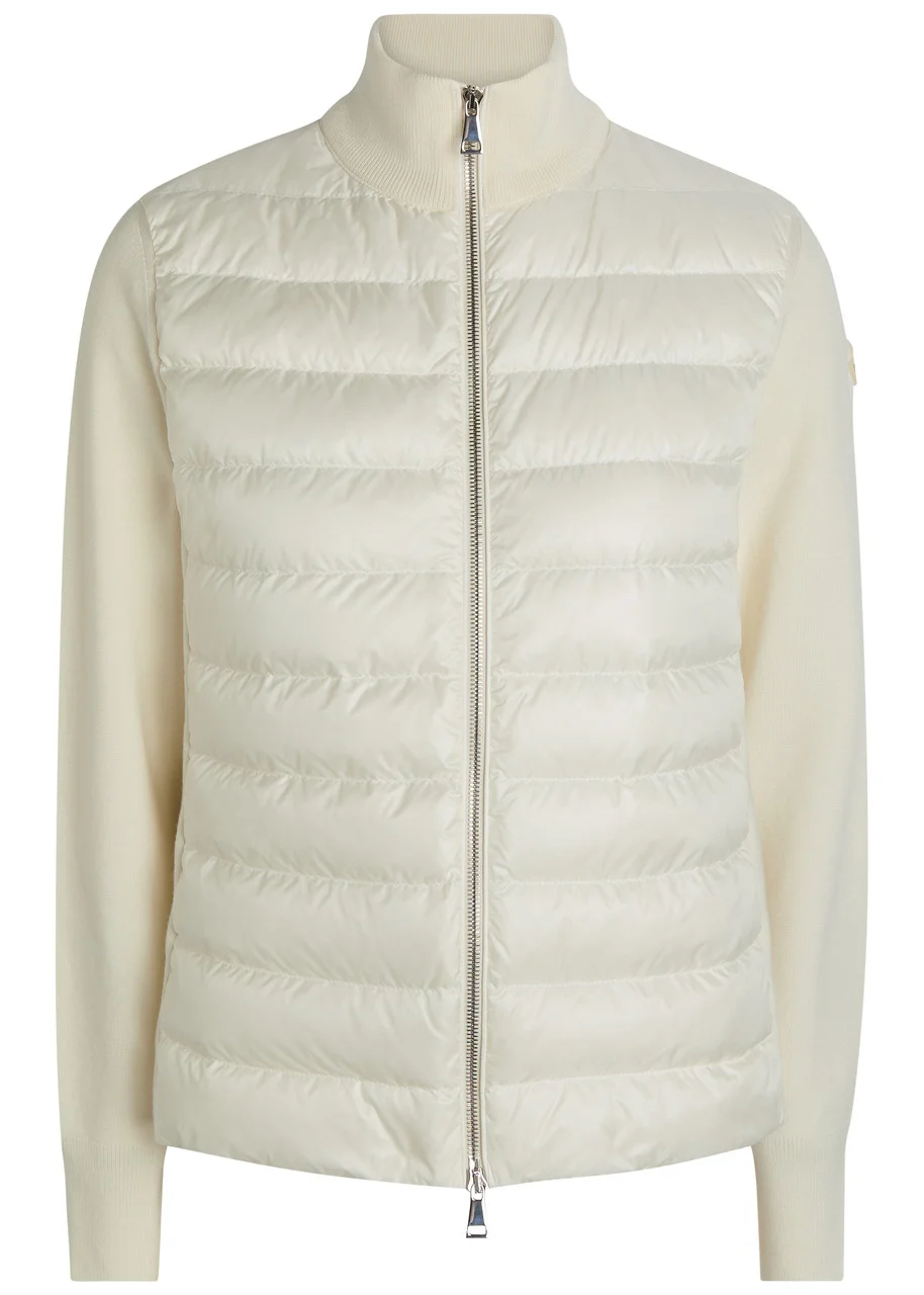 Info & Care Moncler wool jacket Padded nylon front and back, high-neck, embroidered designer applique at sleeve,;partially lined Two-way zip fastening through front Fabric 1: 100% virgin wool; fabric 2: 100% polyamide: fill: 90% pure goose down, 10% feather Dry clean Size & Fit Length shoulder to hem: 23 inches/ 58.5cm Midweight Slim fit Model is 5'8"/ 173cm and wears a size small