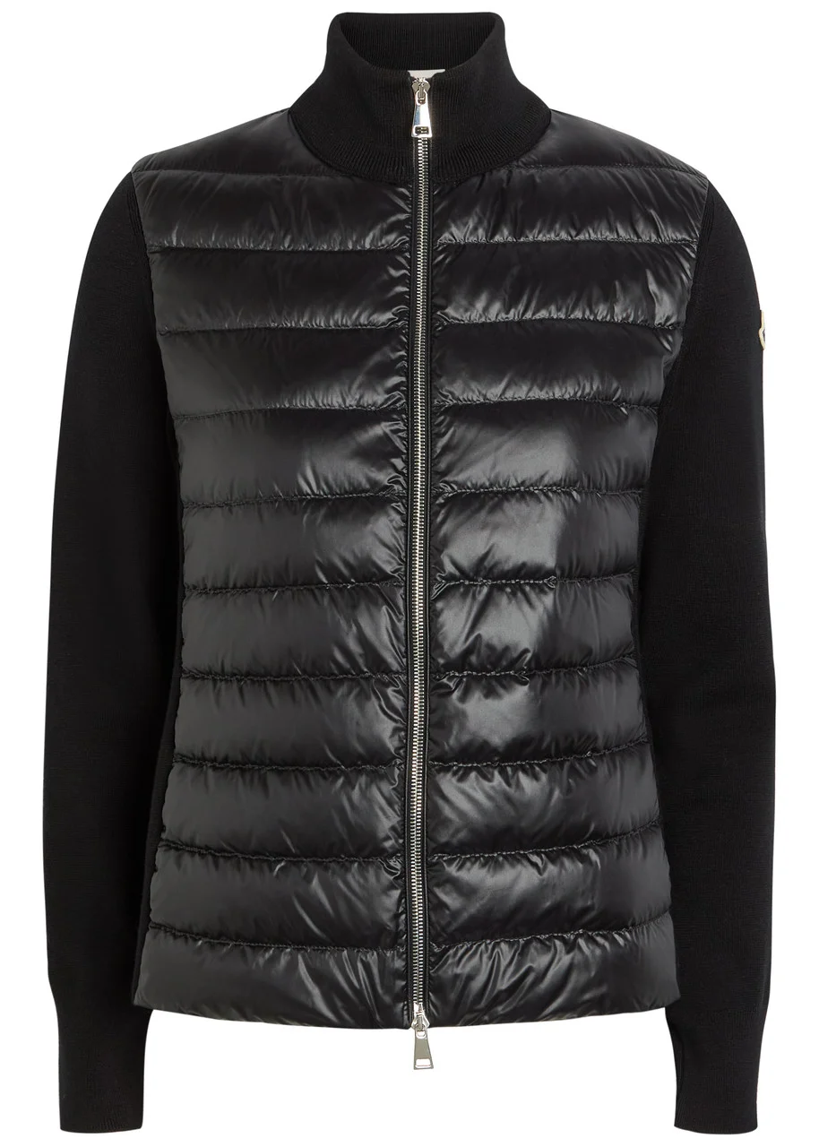Info & Care Moncler wool jacket Padded nylon front and back, high-neck, embroidered designer applique at sleeve,;partially lined Two-way zip fastening through front Fabric 1: 100% virgin wool; fabric 2: 100% polyamide: fill: 90% pure goose down, 10% feather Dry clean Size & Fit Length shoulder to hem: 23 inches/ 58.5cm Midweight Slim fit Model is 5'8"/ 173cm and wears a size small