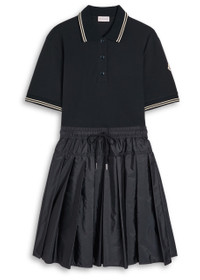 Info & Care Moncler pique;cotton and shell dress Press-stud fastening neck, designer applique at sleeve, stripes at ribbed trims, elasticated drawstring waistband, pleats at shell skirt, designer-engraved hardware Slips on Fabric 1: 100% cotton; fabric 2:;100% polyamide Hand wash Size & Fit Length shoulder to hem: 37 inches/ 94cm Midweight Fit-and-flare style, use drawstring to cinch waist Model is 5'10"/ 178cm and wears a size small