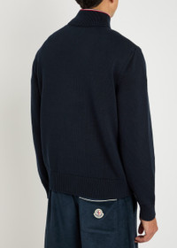 Info & Care Moncler shell and knit;jacket Quilted shell front, stripe-trimmed high-neck, designer applique at sleeve, two zip-fastening front pockets, ribbed trims, designer-engraved hardware Two-way zip fastening through front Fabric 1: 100% cotton; fabric 2: 100% polyester; filling: 90% down, 10% feather Dry clean Size & Fit Length shoulder to hem: 24 inches/ 61cm Midweight Regular fit Model is 6'1"/ 185cm, chest size 38 inches and wears a size medium