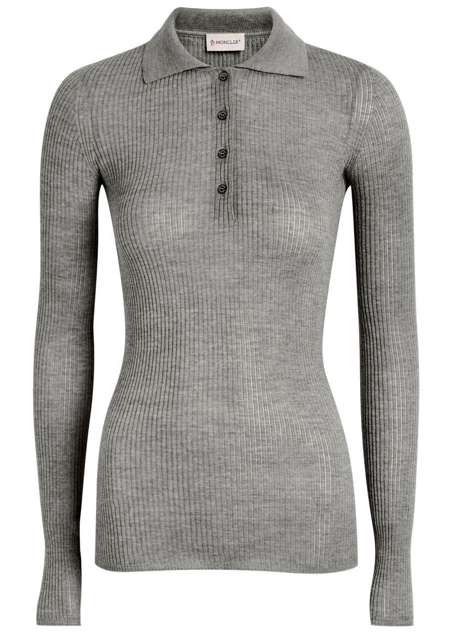 Info & Care Moncler wool polo top Ribbed, button-fastening neck, designer tag at side Slips on 100%;virgin wool Dry clean Size & Fit Length shoulder to hem: 25 inches/ 63.5cm Midweight Slim fit Model is 5'9"/ 175cm and wears a size small