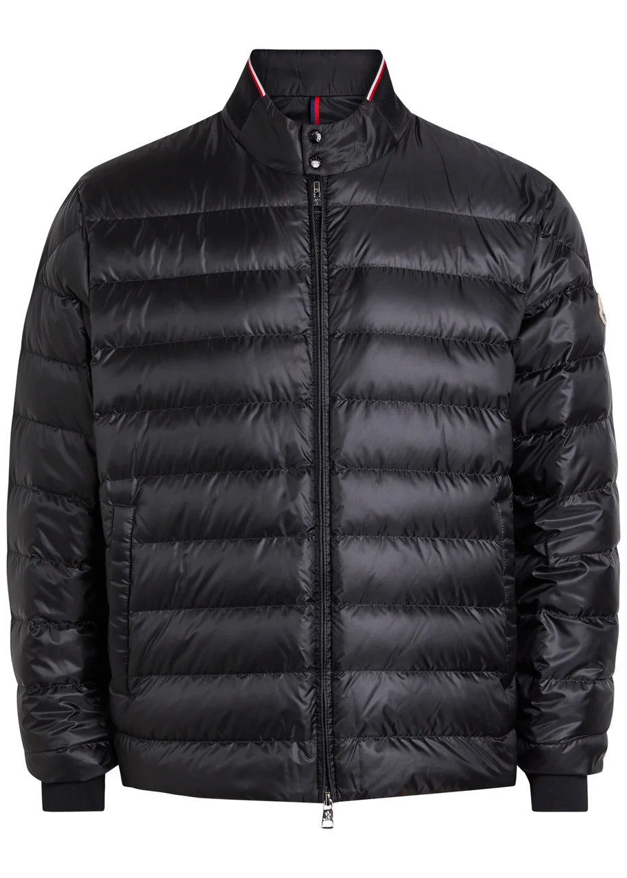 Info & Care Moncler;shell jacket Quilted, press-stud fastening high neck, stripe-trimmed neck, designer applique at sleeve, press-stud fastening side slip pockets, ribbed-knit trims, internal zip-fastening slip pocket, fully lined Two-way zip fastening through front 100% polyamide; lining: 100% polyamide; fill: 90% down, 10% feathers Machine wash Size & Fit Length shoulder to hem: 25 inches/ 64cm Midweight Regular fit Model is 6'1"/ 185cm, chest size 36 inches and wears a size;3