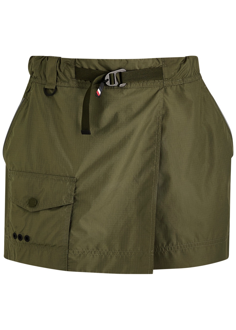 Info & Care Moncler Grenoble shell;skort Fine check, hook fastening at elasticated waist, belt loops, D-ring embellishment, reflective piped trim at side slip pockets, press-stud fastening patch pocket at front, designer plaque and tag at back, rubber eyelet details; Pull on 100% polyester Machine wash Size & Fit Length shoulder to hem: 15 inches/ 38cm Midweight Regular fit Model is 5'10"/ 178cm and wears a size small