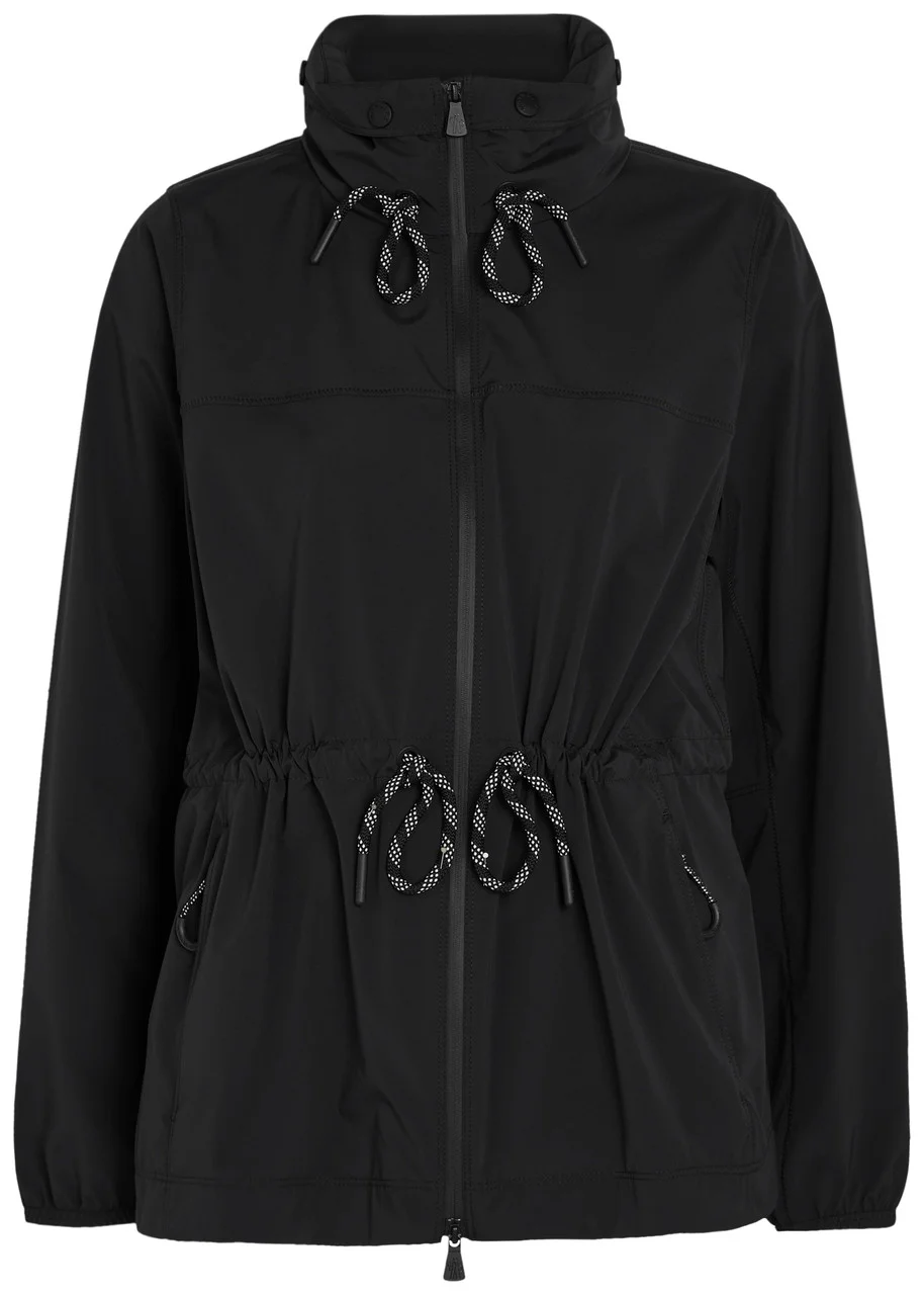 Info & Care Moncler stretch-shell jacket Water-repellant, packable hood at high-neck, embroidered designer applique at sleeve, elasticated cuffs, zip-fastening side pockets, internal mesh shoulder straps,; Two-way zip fastening through front 84% polyamide, 16% elastane Hand wash Size & Fit Length shoulder to hem: 27 inches/ 68.5cm Midweight Relaxed fit, use drawstring to cinch the waist Model is 5'10"/ 178cm and wears a size 0