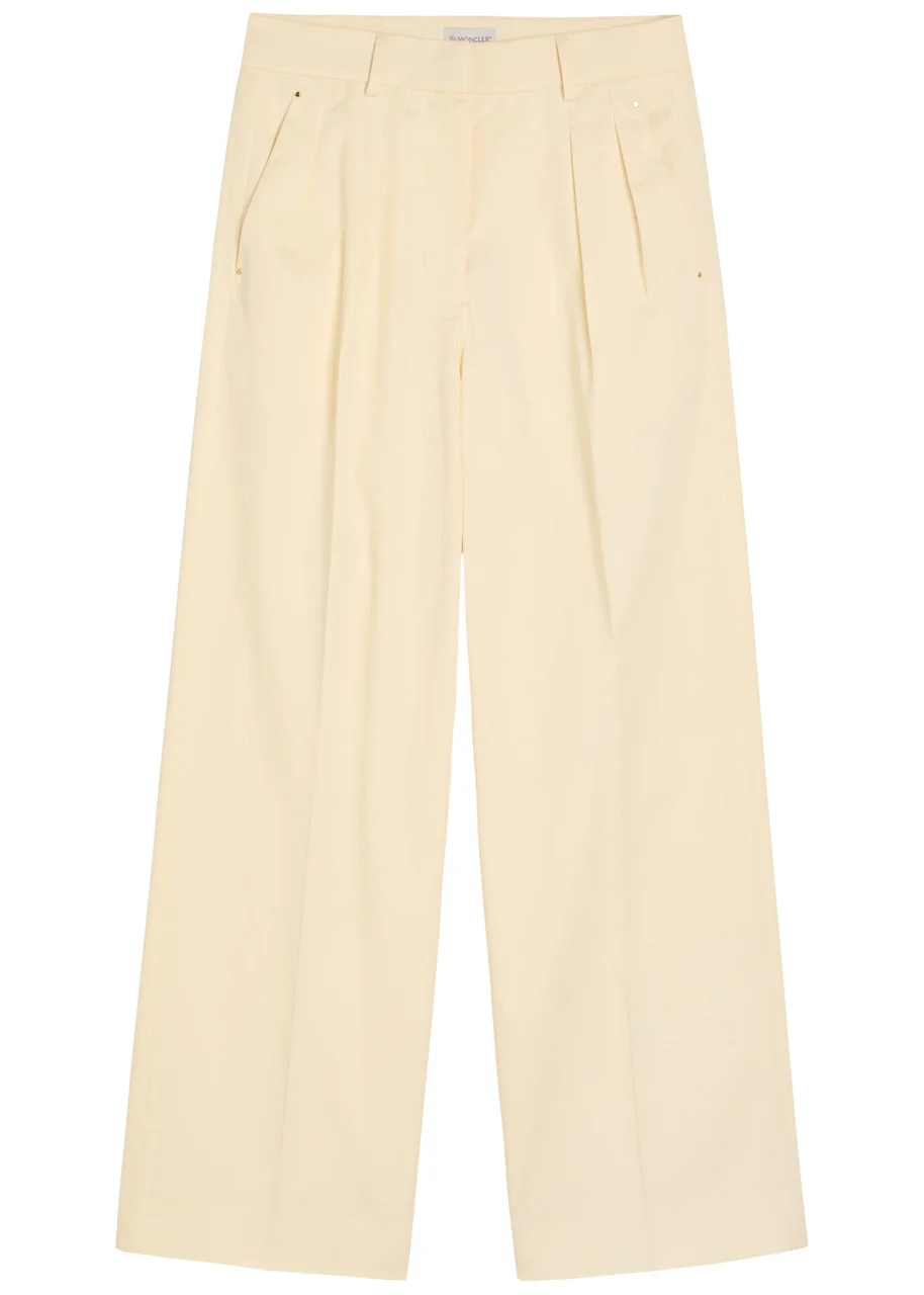 Info & Care Moncler cotton-poplin trousers Belt loops, pleats at waist, side slip pockets, pressed crease through legs, designer plaque at back, back welt pockets Concealed zip, button and;hook;fastening at front 100% cotton Dry clean; Size & Fit Inside leg length: 31 inches/ 79cm Midweight Straight-leg cut, high-rise fit Model is 5'9"/ 175cm and wears a size;IT40