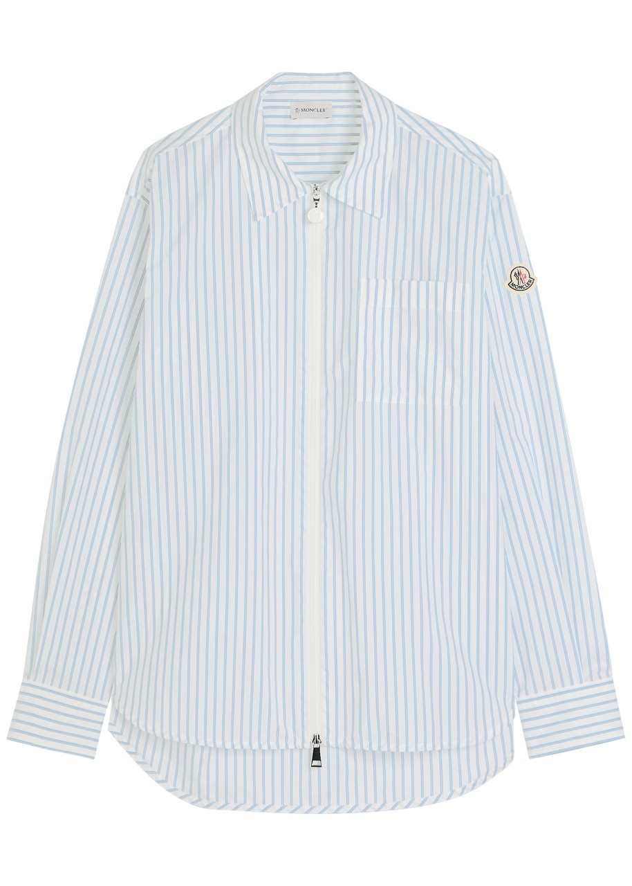 Info & Care Moncler shell shirt Striped, embroidered designer applique at sleeve, press-stud fastening cuffs, chest patch pocket, curved hem Two-way zip fastening at front; 100% polyamide Machine wash; Size & Fit Length shoulder to hem: 27.5 inches/ 70cm Midweight Loose fit Model is 5'9"/ 175cm and wears a size small