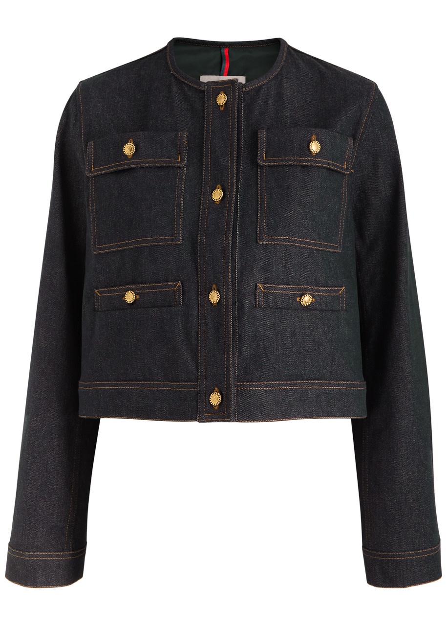 Info & Care Moncler denim jacket Round-neck, designer plaque at sleeve, button-fastening cuffs, four front slip pockets with faux flap front, shell panel across back with gathered details, contrasting stitching, designer-engraved hardware, slightly cropped; Button-fastenings through front 98% cotton, 2% elastane Machine wash cold inside out to avoid colour transfer Size & Fit Length shoulder to hem: 18.5 inches/ 47cm Midweight Boxy fit Model is 5'9"/ 175cm and wears a size;1