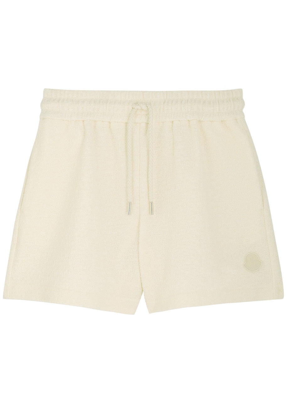 Info & Care Moncler terry shorts Drawstring at elasticated waist, side slip pockets, designer applique at hem Pull on 60% polyester, 36% cotton, 2% other fibres, 2% elastane Machine wash Size & Fit Length waist to hem: 14.5 inches/ 37cm Midweight; Regular fit ; Model is 5'9"/ 175cm and wears a size small