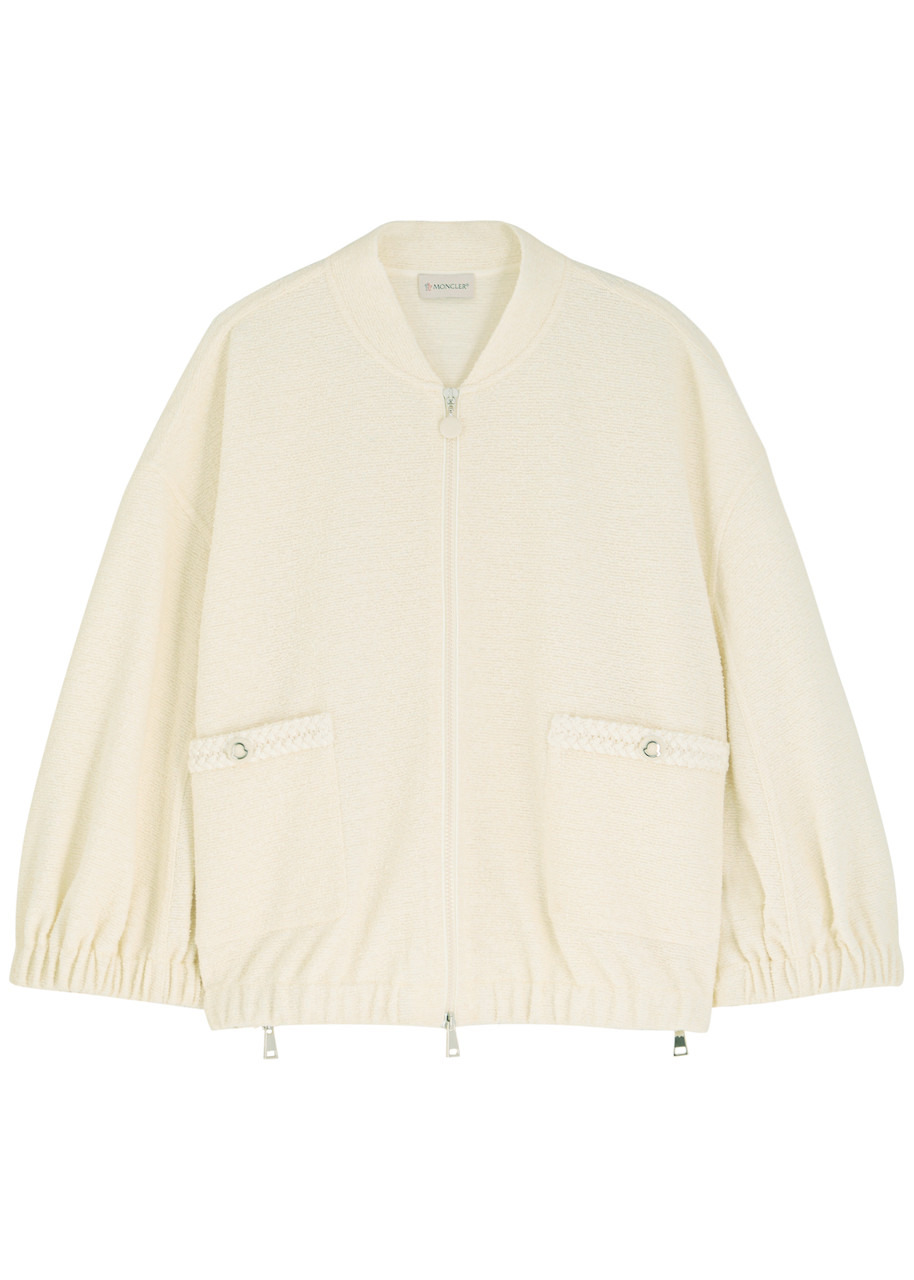 Info & Care Moncler terry sweatshirt Stand collar, dropped shoulders, designer applique at sleeve, faux pockets at front, zip-fastening sides, elasticated trims Two-way zip fastening at front 60% polyester, 36% cotton, 2% other fibres, 2% elastane Hand wash; Size & Fit Length shoulder to hem: 22 inches/ 56cm Midweight Relaxed fit Model is 5'9"/ 175cm and wears a size small