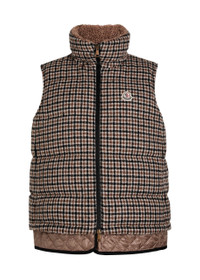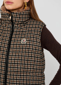 Info & Care Moncler wool-blend gilet Houndstooth weave, quilted, high-neck with faux;shearling lining, designer applique at chest, zip-fastening side pockets, layered-effect hem, quilted lining Two-way zip-fastening through front 58% wool, 24% polyamide, 18% lyocell; lining: 100% polyamide; fuilling: 90% down, 10% feather Dry clean Size & Fit Length shoulder to hem: 25.5 inches/ 65cm Midweight Regular fit Model is 5'9"/ 175cm and wears a size 0