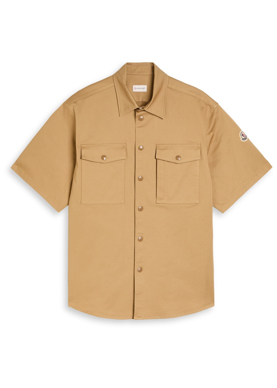 Info & Care Moncler stretch-cotton shirt; Embroidered designer applique at sleeve, two push-stud fastening flap pockets at front, curved hem, designer-engraved hardware Push-stud fastenings through front 98% cotton, 2% elastane Machine wash; Size & Fit Length shoulder to hem: 27 inches/ 68.5cm Midweight Relaxed fit Model is 6'1"/ 186cm, chest size 36 inches and wears a size medium
