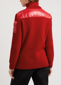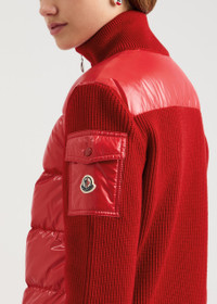 INFO & CARE - Moncler wool jacket - Ribbed, high-neck, quilted glossed shell front and panel at back, designer plaque at button-fastening shell sleeve pocket, two concealed zip-fastening side pockets, partially lined - Two-way zip fastening through front - Fabric1: 100% polyamide; fabric 2: 100% virgin wool; lining: 100% polyamide; filling: 90% down, 10% feather - Dry clean SIZE & FIT - Length shoulder to hem: 26.5 inches/ 67.5cm - Midweight - Regular fit - Model is 5'7"/ 170cm and wears a size small