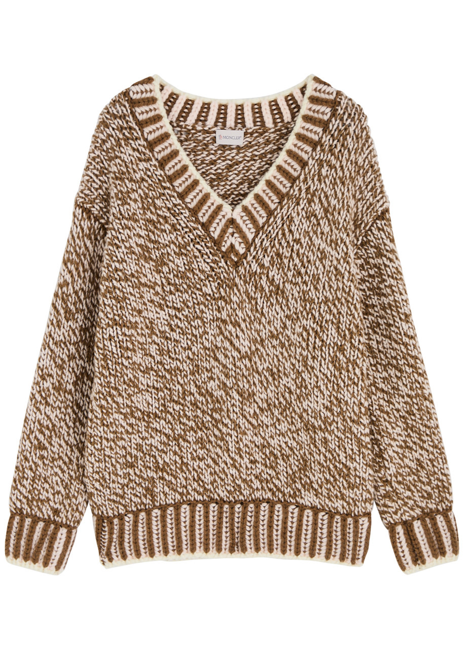 INFO & CARE - Moncler wool-blend jumper - Ribbed, v-neck, dropped shoulders, designer plaque at sleeve - Slips on - 70% virgin wool, 30% acrylic - Dry clean SIZE & FIT - Length shoulder to hem: 27 inches/ 68.5cm - Midweight - Relaxed fit - Model is 5'9"/ 175cm and wears a size xs