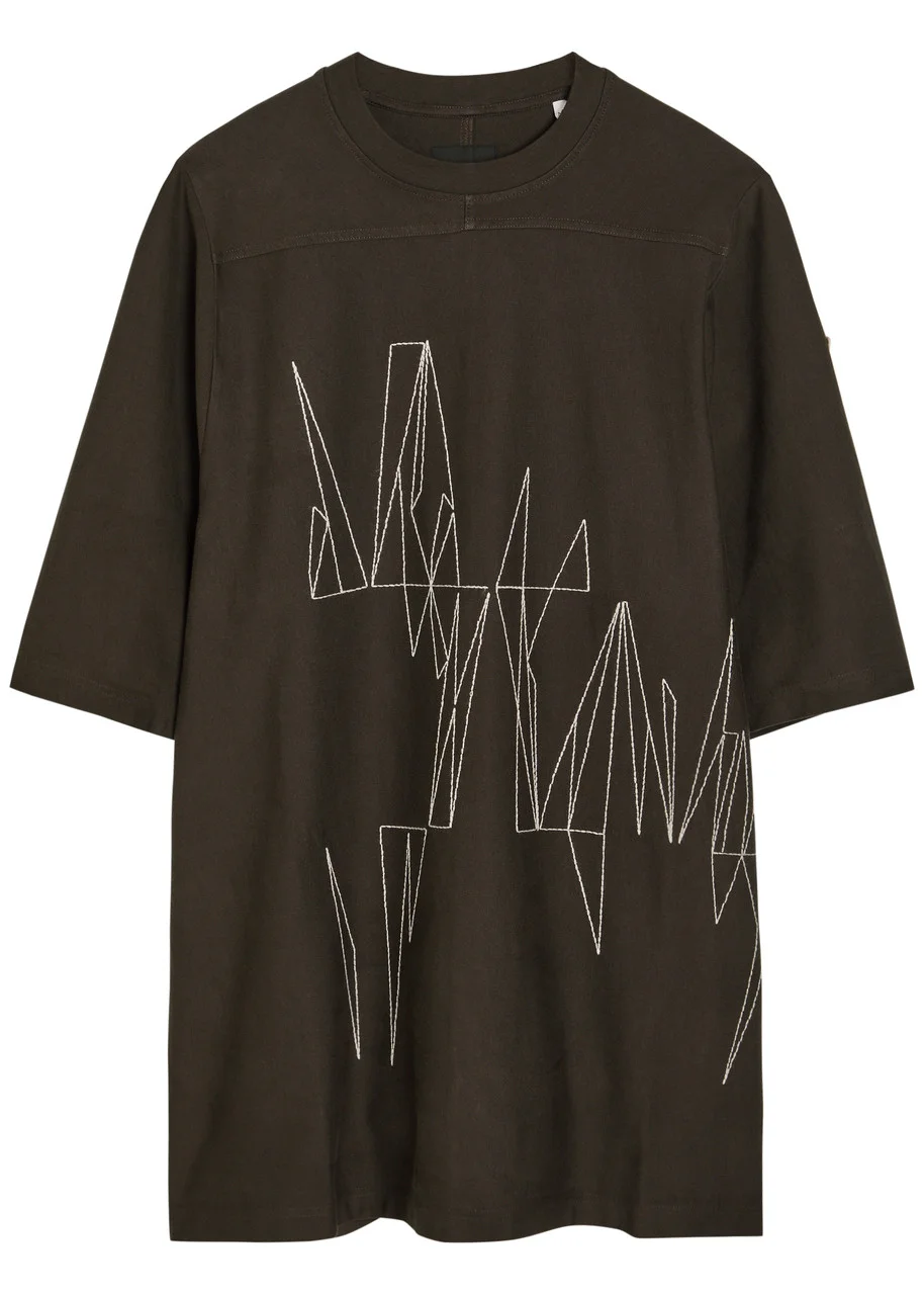 Info & Care Rick Owens X Moncler cotton T-shirt Designer embroidery, ribbed crew-neck, logo applique at sleeve Slips on 100% cotton Machine wash Coordinating items available Size & Fit Length shoulder to hem: 34 inches/ 86.5cm Midweight Oversized fit Model is 6'2"/ 188cm, chest size 38 inches and wears a size medium