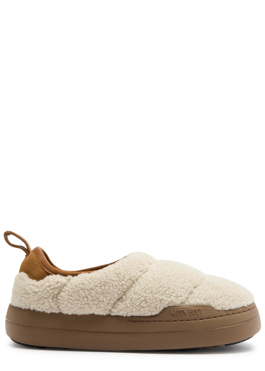 Info & Care Moon Boot fleece;mules Flatform;measures approximately 1.5 inches/ 40mm Quilted front panel, debossed designer logo at suede heel tab, suede heel panel, textured EVA midsole with embossed logos, gripped thermoplastic rubber sole, round-toe Slip on; Size & Fit Only available in full sizes, go up to the nearest whole size if you take a half size;