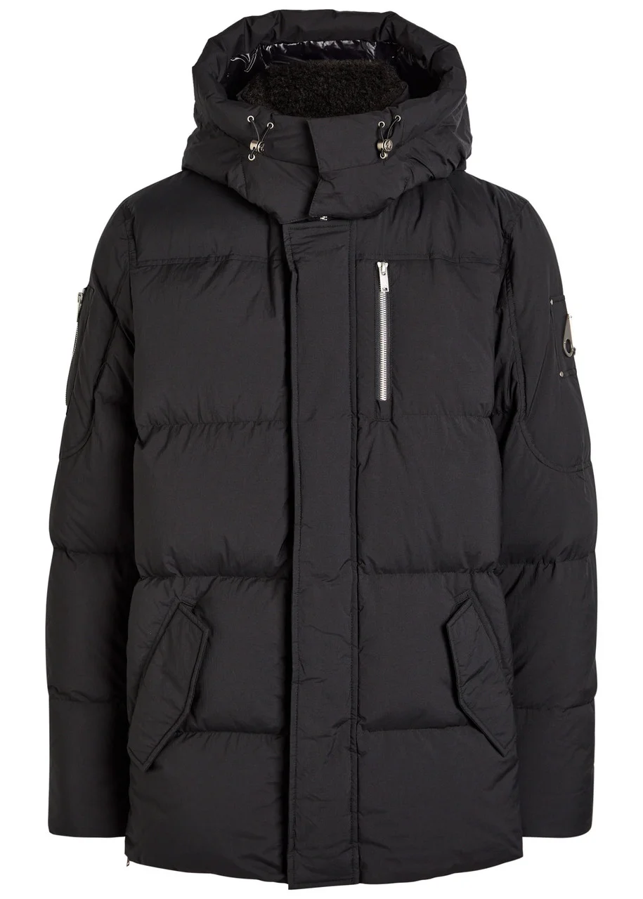 Info & Care Moose Knuckles;shell puffer coat Padded, detachable drawstring hood with adjustable tab, designer plaque at sleeve, zip-fastening sleeve pocket, rib-knit cuffs, zip-fastening side splits at cuffs and hem, zip-fastening chest pocket, press-stud fastening front flap pockets, internal zip-fastening pocket, fully lined Partially concealed two-way zip and press-stud fastening through front 57% recycled nylon, 40% cotton, 3% elastane; lining: 100% nylon; filling: 90% duck down, 10% duck feathers Machine wash; Size & Fit Length shoulder to hem: 31 inches/ 79cm; Midweight Regular fit Model is 6'2"/ 188cm, chest size 38 inches and wears a size medium