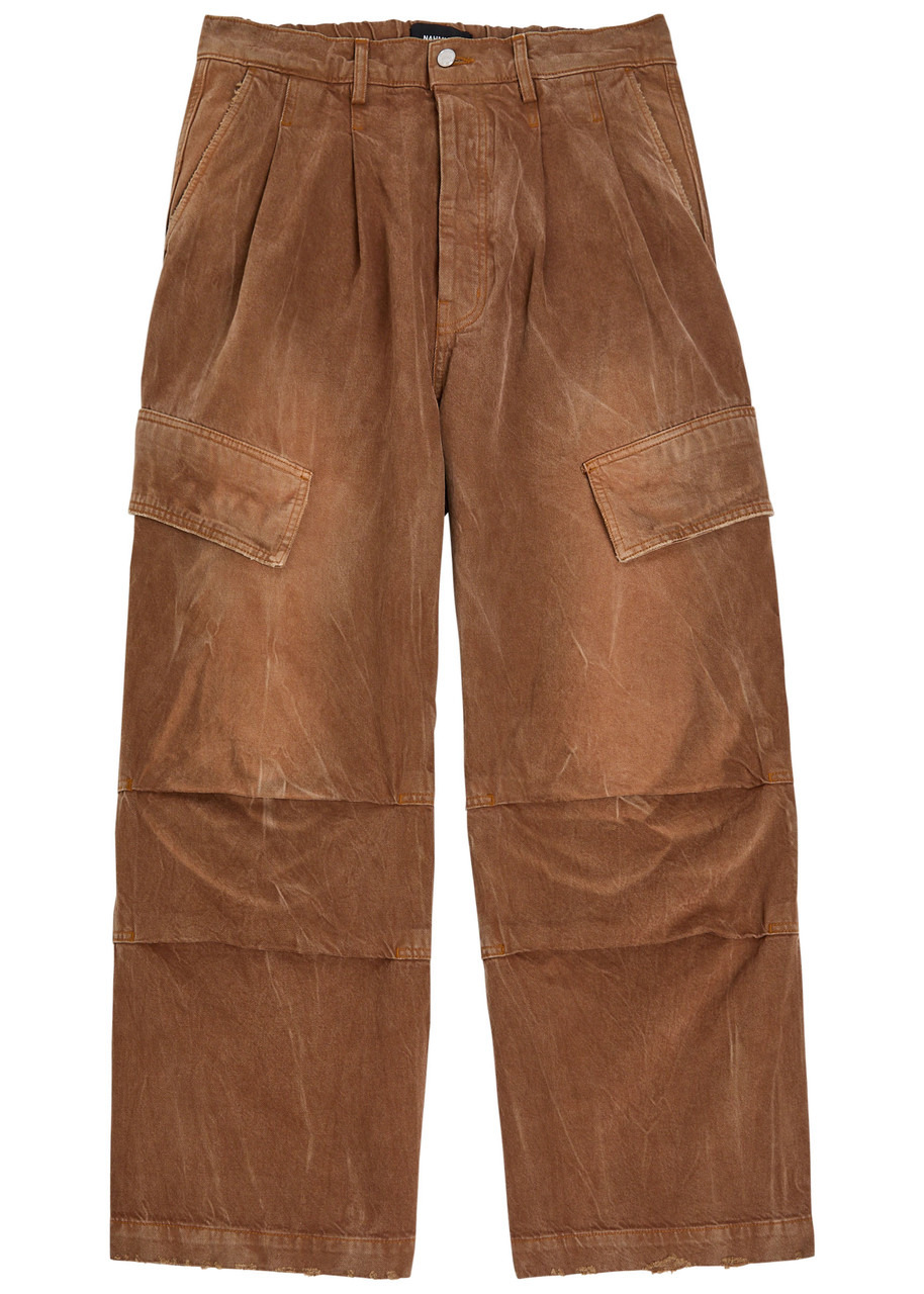 Info & Care Nahmias denim cargo trousers Partially elasticated waistband, belt loops, side slant pockets,;pleats at waist and knees, velcro-fastening flap pockets at sides, velcro-fastening back flap pockets, rubberised designer plaque at back, distressed details, faded finish Partially concealed button fastenings at front 100% cotton Machine wash cold inside out to avoid colour transfer Size & Fit Inside leg length: 30 inches/ 76.5cm Heavyweight Relaxed, straight-leg cut Oversized style Model is 6'2"/ 188cm and wears a size medium