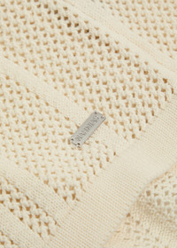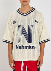 Info & Care Handmade Nahmias cotton shirt Open knit, V-neck, dropped shoulders, designer intarsia, metal designer plaque at hem, ribbed striped-intarsia trims Slips on 100% cotton Dry clean Size & Fit Length shoulder to hem: 28 inches/ 71cm Midweight Relaxed;fit Model is 6'1"/ 185cm, chest size 38 inches and wears a size medium