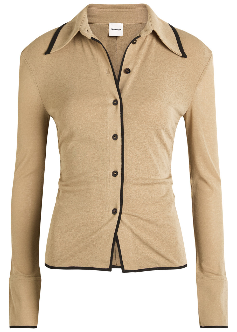 Info & Care Nanushka mesh-jersey;shirt Button-fastening cuffs,;gathered sides, notched front hem, contrasting trims Button fastenings through front 100% polyester Machine wash; Size & Fit Length shoulder to hem: 21.5 inches/ 54.5cm Midweight Slim fit, cinched at waist Model is 5'9"/ 175cm and wears a size small
