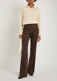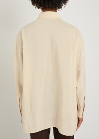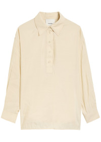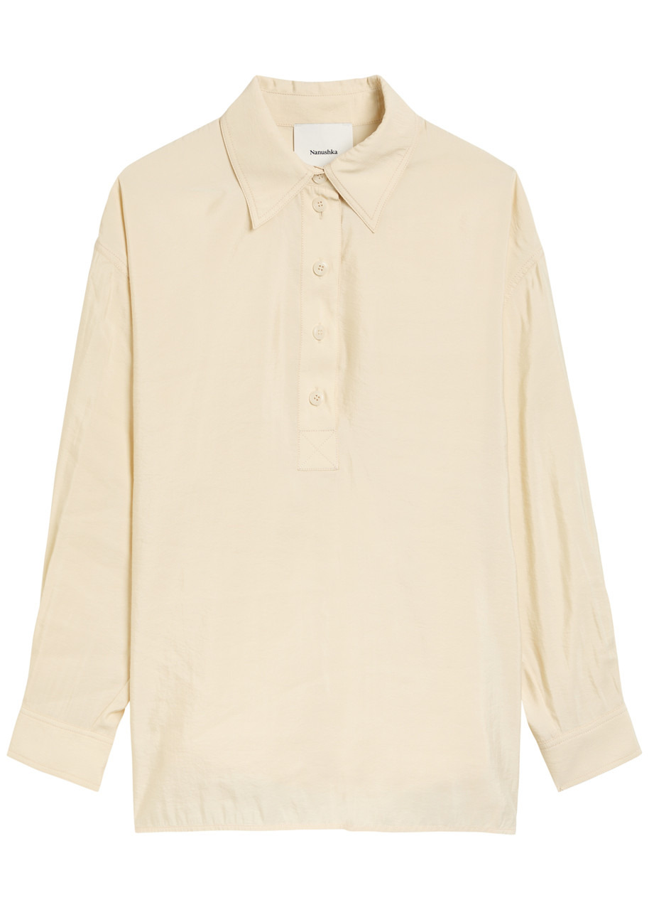 Info & Care Nanushka poplin;polo shirt Button-fastening neck, dropped shoulders, button-fastening cuffs, side splits,;crinkled finish; Slips on 74%;viscose, 26% viscose Machine wash; Size & Fit Length shoulder to hem: 28 inches/ 71.5cm Midweight Designed for oversized look Loose fit Model is 5'9"/ 175cm and wears a size small