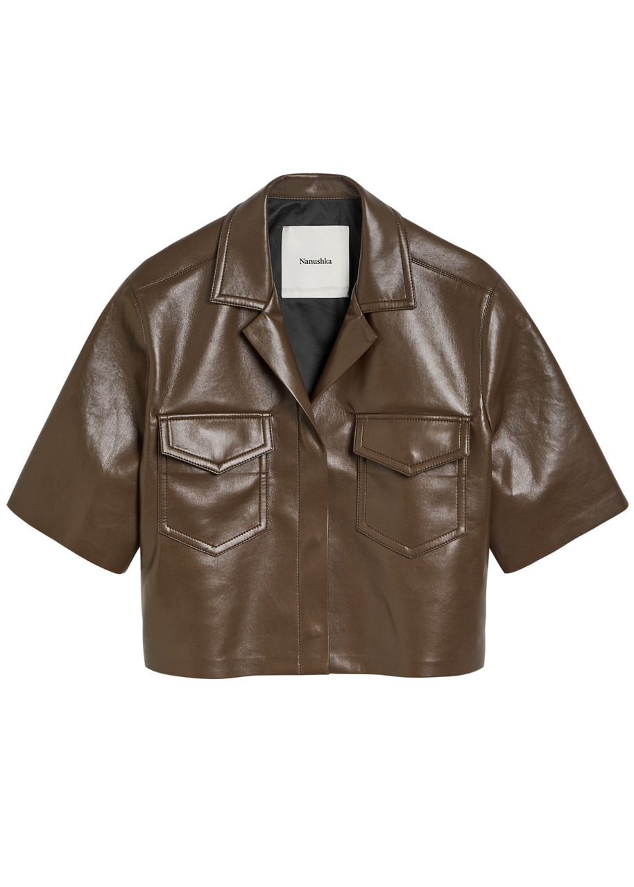 Info & Care Nanushka faux leather;shirt Camp collar, press-stud fastening flap pockets at chest, partially lined Concealed press-stud fastenings through front 100% polyester; coating: 100% polyurethane; lining: 100% viscose Dry clean Size & Fit Length shoulder to hem: 18 inches/ 46cm Midweight Loose fit Model is 5'9"/ 175cm and wears a size small